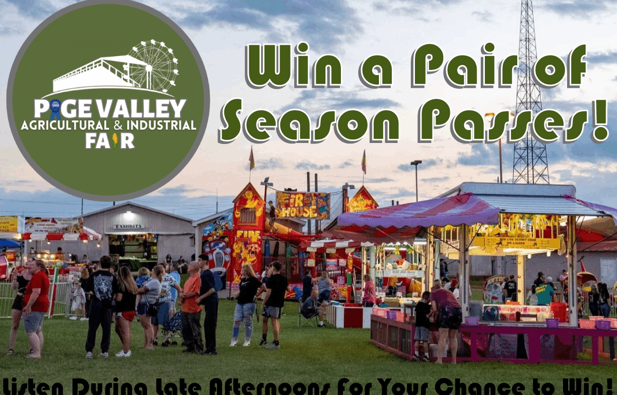 -Listen weekdays during the contest window. Listen for the cue to call, and Caller #25 will win a pair of season passes to the Page Valley Fair. Season passes include admission into the fair and grandstand events. Season passes do NOT include admission into concerts. The Page Valley Fair is from August 16-23, 2025.