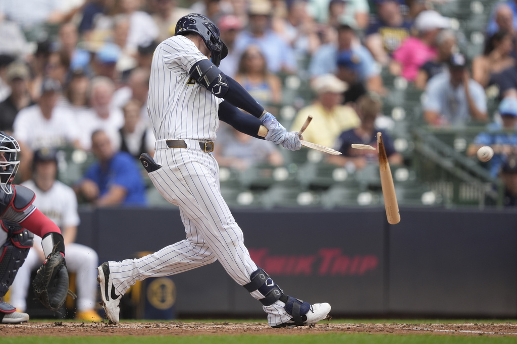 Milwaukee right fielder Sal Frelick left Sunday’s game against Washington after making a terrific catch in foul territory in the third inning.