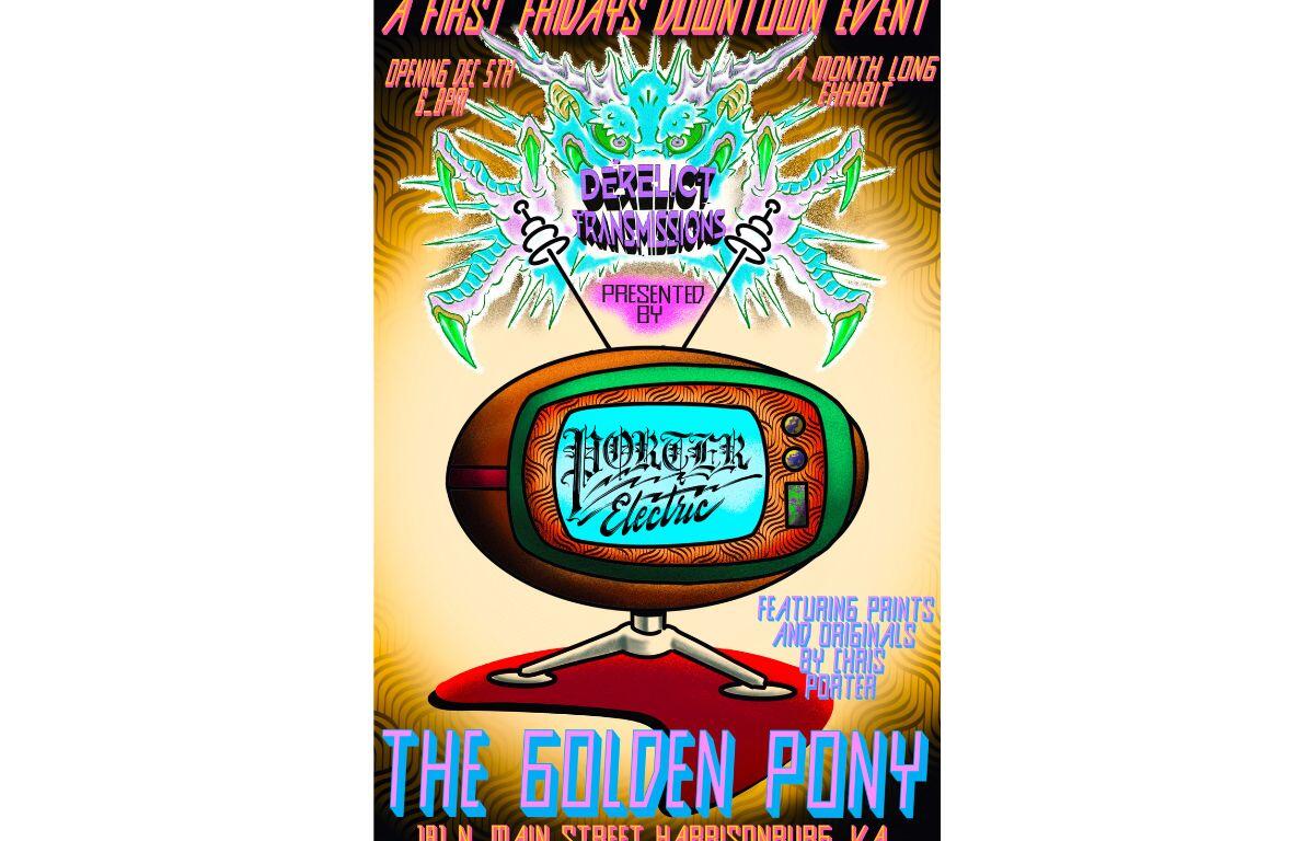 HARRISONBURG, VA (Rocktown Now) – Chris Porter invites the community to the unveiling of his first solo exhibition, Derelict Transmissions, at The Golden Pony running from Friday, December 5 to Wednesday, December 31.