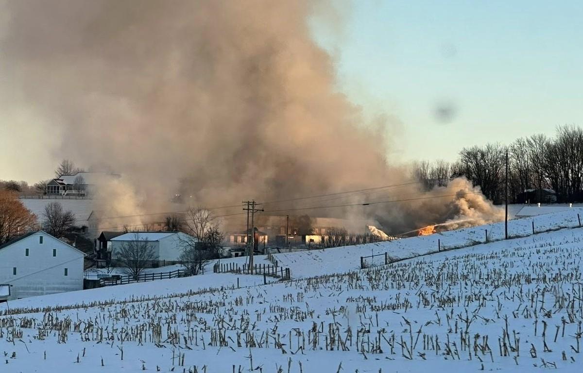 BRIDGEWATER VA: (Rocktown Now) – Rockingham County firefighters remain on scene of a structure fire this morning that has caused heavy damage to T & L Woodcraft, located on Spring Creek Road, west of Bridgewater. Bridgewater units were first called to the scene around 11:30 Saturday morning and found heavy fire and smoke. Assisted by fire companies from Cloverhill, Mt Solon, Weyers Cave, Grottoes, Hose Company Number 4 and the City of Harrisonburg, firemen needed to deal with a lack of water, but also the extreme cold and wind. Because of the remote location, tankers were used through the day and overnight to bring water from Bridgewater to the scene, over 3 miles outside of town. The fire caused extensive damage to the main woodwork shop as well as surrounding rooms and buildings.