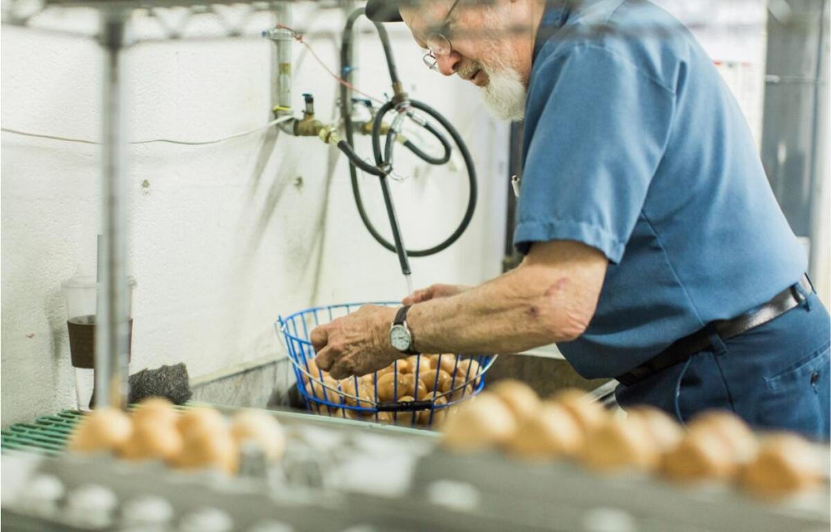 - Eggs are collected by hand daily, sorted by size (from younger to mature layers), hand cleaned and weighed.