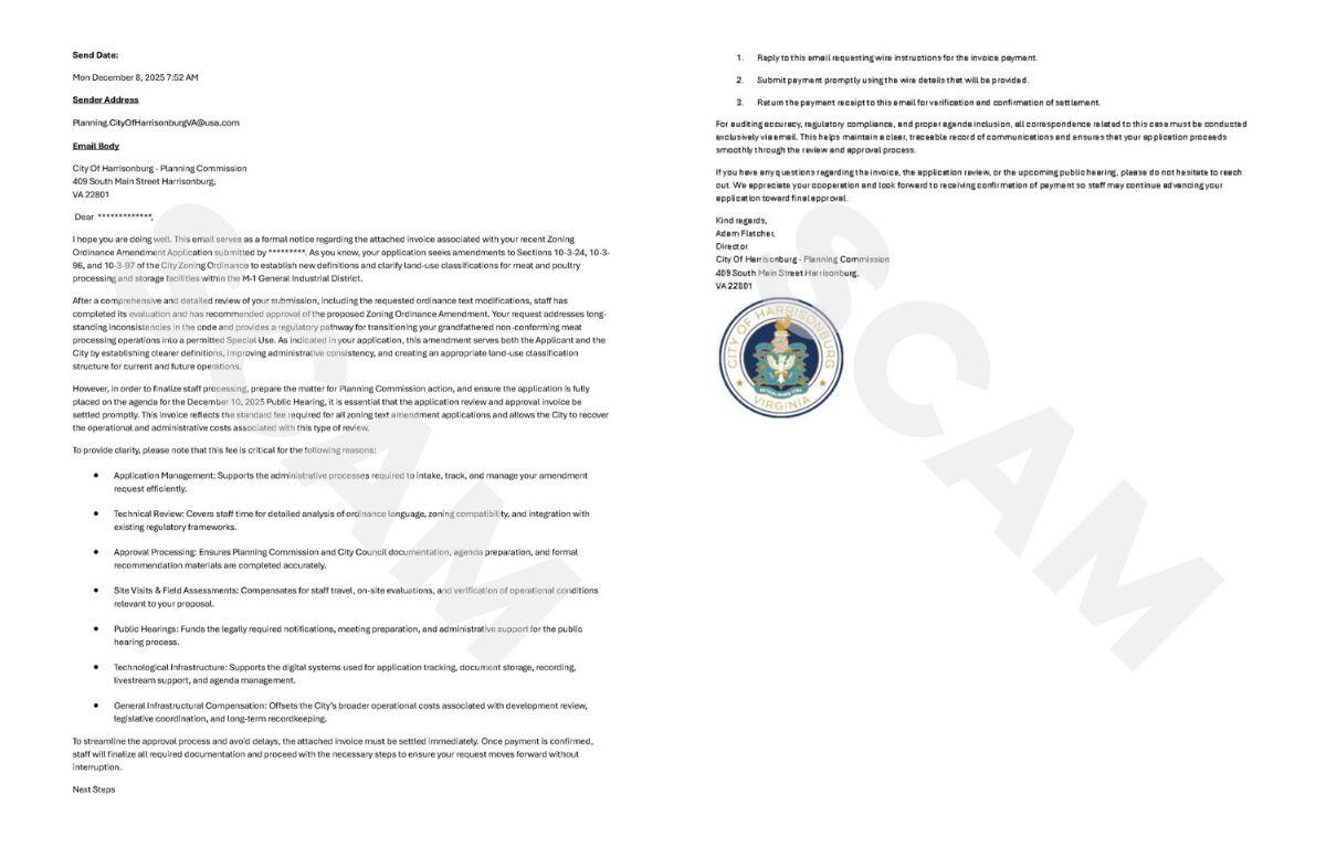 HARRISONBURG, VA (Rocktown Now) — The Harrisonburg Police Department (HPD) announced on the department’s social media page that someone has been trying to impersonate the Community Development Department with fake invoices. These emails are being sent to individuals who have applied for land use approvals through Community Development.