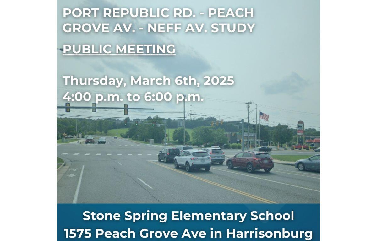 A public meeting will be held next Thursday, March 6, at Stone Spring Elementary School to discuss a study detailing recommendations for the future of the Port Republic Road–Peach Grove Avenue–Neff Avenue corridor.