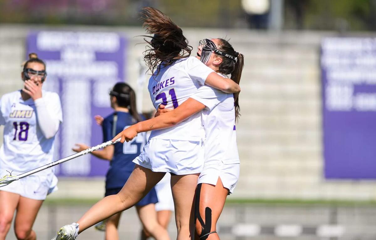The Dukes (8-6, 3-1 American) controlled all phases of the game, taking the lead in the first quarter and holding it for the remainder of the contest. Brianna Mennella and Olivia Matthews both recorded their second straight hat tricks, with Mennella adding an assist. Payton Root led the team with six points, consisting of a goal and five assists. In total, nine different JMU players found the scoring column.