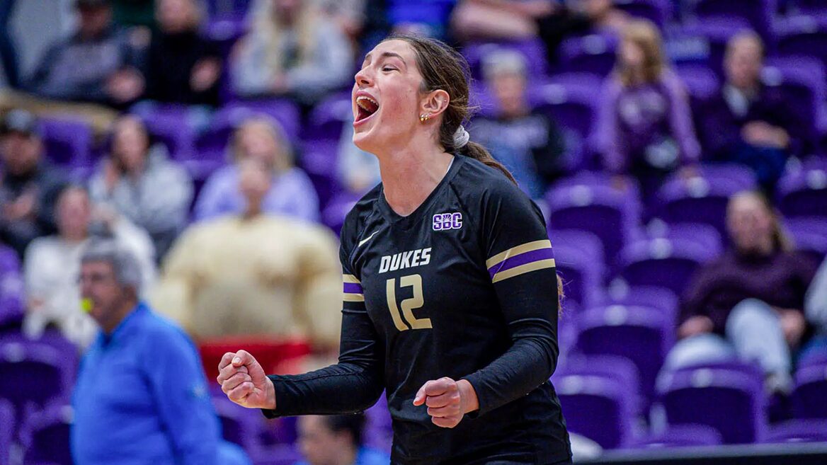Kennedy Louisell paced the Dukes with 19 kills – including the final three in the fifth set – and a season-high 14 digs for her eighth double-double of the season. Freshman Ana Toumazatos had 14 kills, while sophomore Ayen Nhial hit .353 with a season-high nine kills.