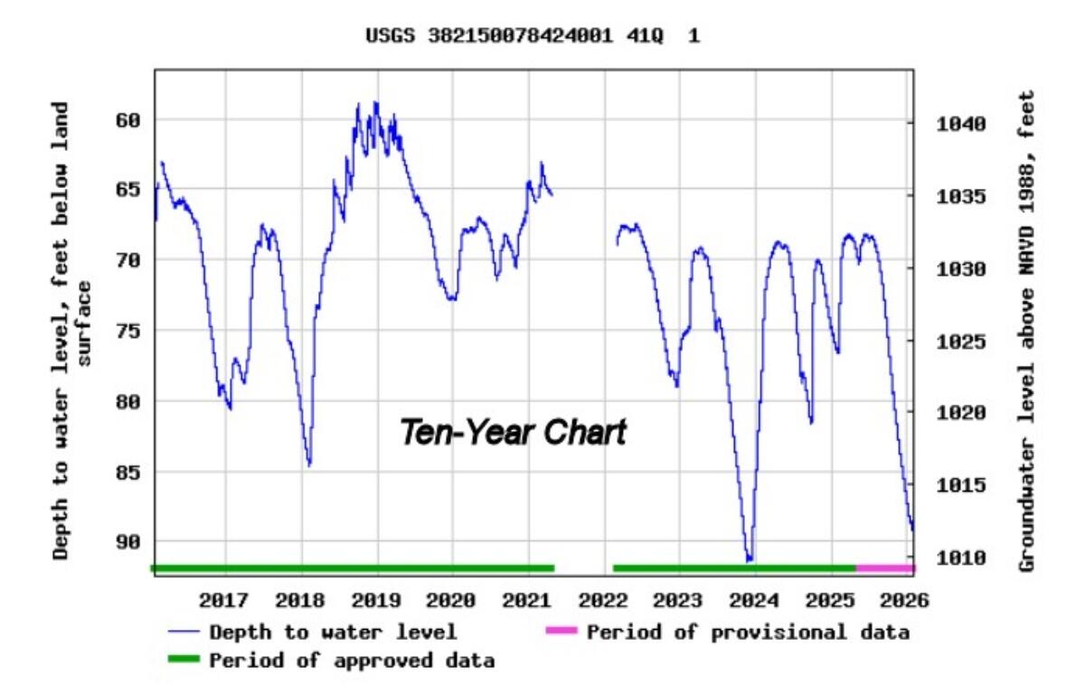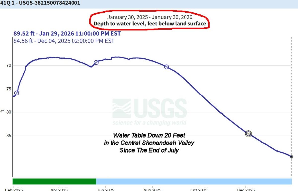 ROCKINGHAM COUNTY, VA (Rocktown Now) — Despite the heavy sleet and frozen precipitation delivered by Winter Storm Fern, groundwater levels in the central Shenandoah Valley continue to decline. The storm coated Rockingham and surrounding counties with hours of icy mix, but the U.S. Geological Survey (USGS) reports that most of that moisture remains locked at the surface and has not yet filtered into the aquifer.