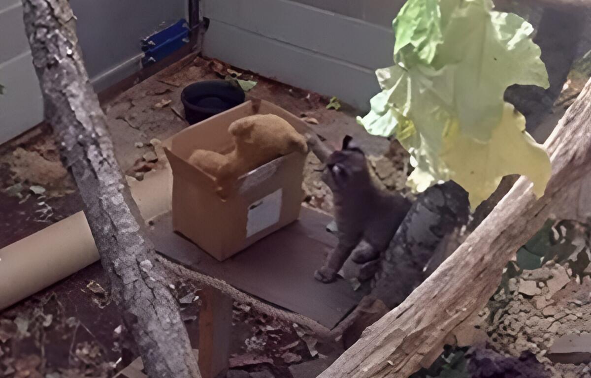 In early October, the Bobcat’s progress earned her a move from the Center’s indoor ICU to a larger outdoor space—one of the Center’s secure bear pens. The enclosure offers a complex environment with plenty of opportunities to climb, hide, and explore. Soon after the move, remote cameras captured her sunbathing, stalking insects, and wrestling with branches.