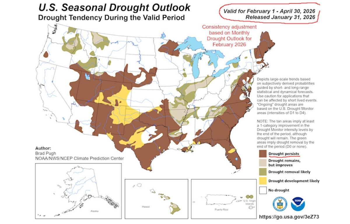 NOAA analysts note that meaningful drought recovery typically requires sustained precipitation over many weeks, something this winter has yet to provide. Local municipalities are urging farmers and residents to be mindful of water use as the region awaits a more prolonged shift in weather patterns.