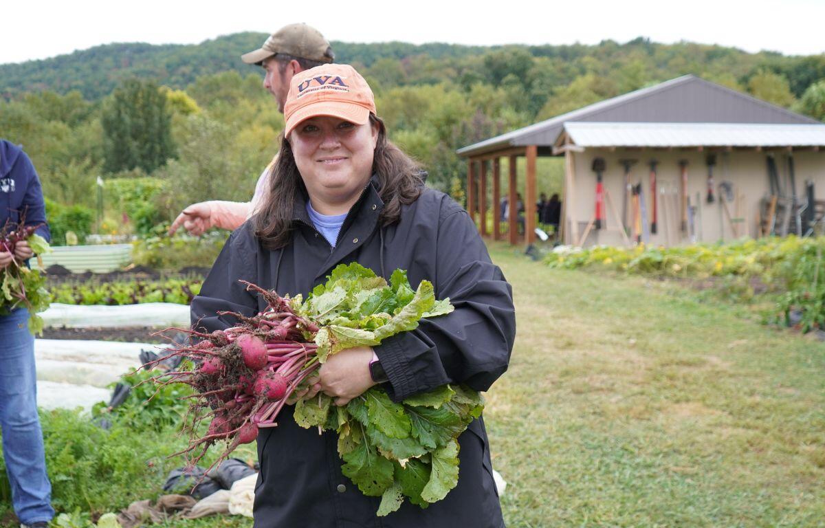 A participating teacher shows off a batch of freshly harvested radishes during the Farm to Fork professional development at the Waynesboro Education Farm. | Source: Waynesboro Public Schools